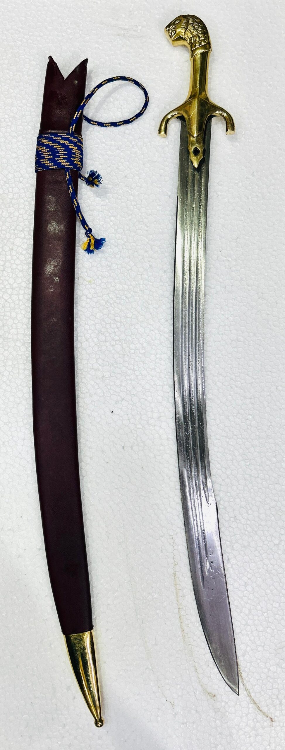 Unlike other swords, this sword has a round tip. The length of the blade is 33 inches and the total length is 38 inches. The blade is made of carbon steel, Light in weight, easy to use and best in class. The blade of this sword broadens up near the tip. One can easily fall in love with this sword. The scabbard is made of wood wrapped in genuine brown leather. The colour of the leather can be changed according to the customer’s choice. The hilt of the sword and chape are hand engraved with floral patterns. Both the hilt and the chape are made of Brass . To place an order kindly fill the inquiry form.